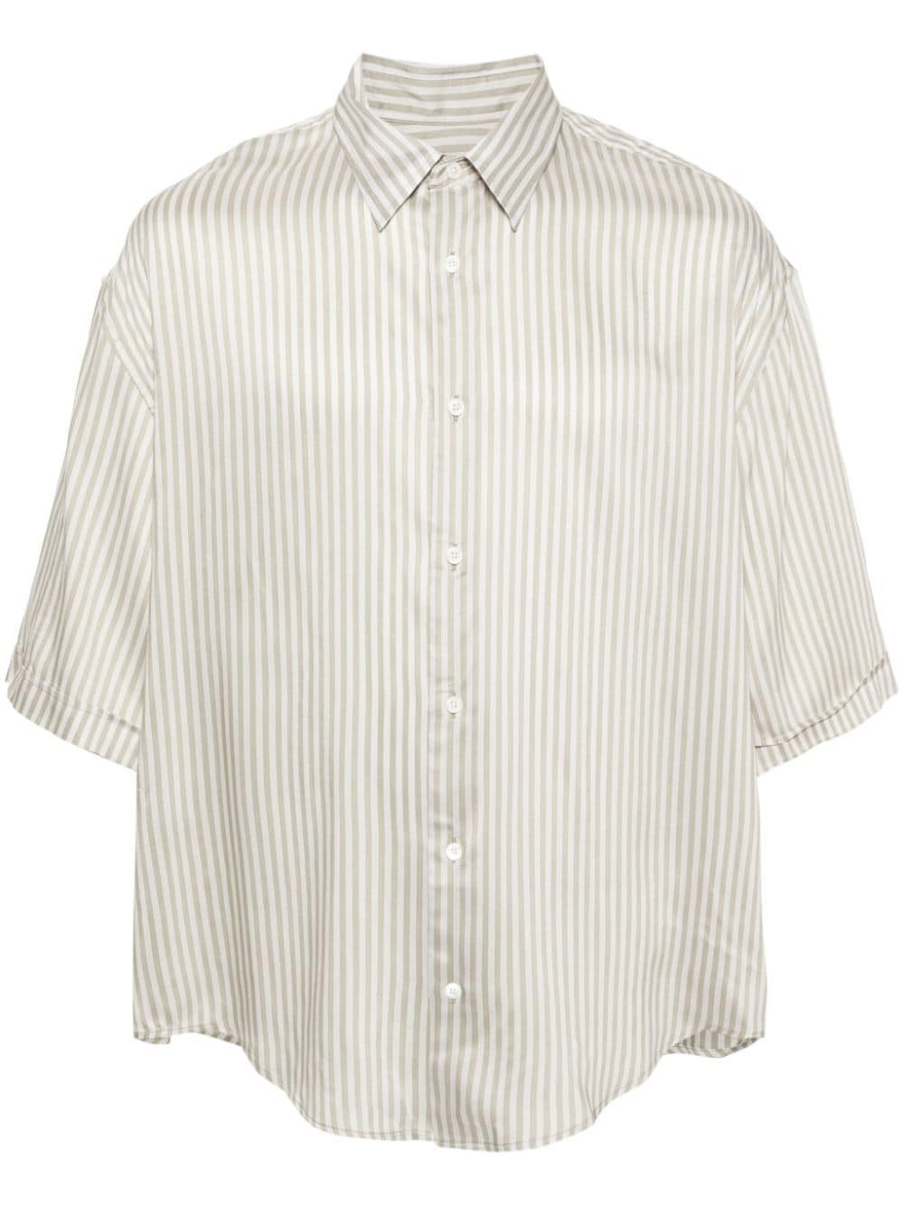 Ami de Coeur monogram-motif shirt Highlights - Light beige/sage green - Vertical stripe pattern - Signature ami de coeur monogram motif to the rear - Pointed flat collar - Short sleeves - Curved hem - Front button fastening Made in France Composition Viscose 82%, Silk 18%