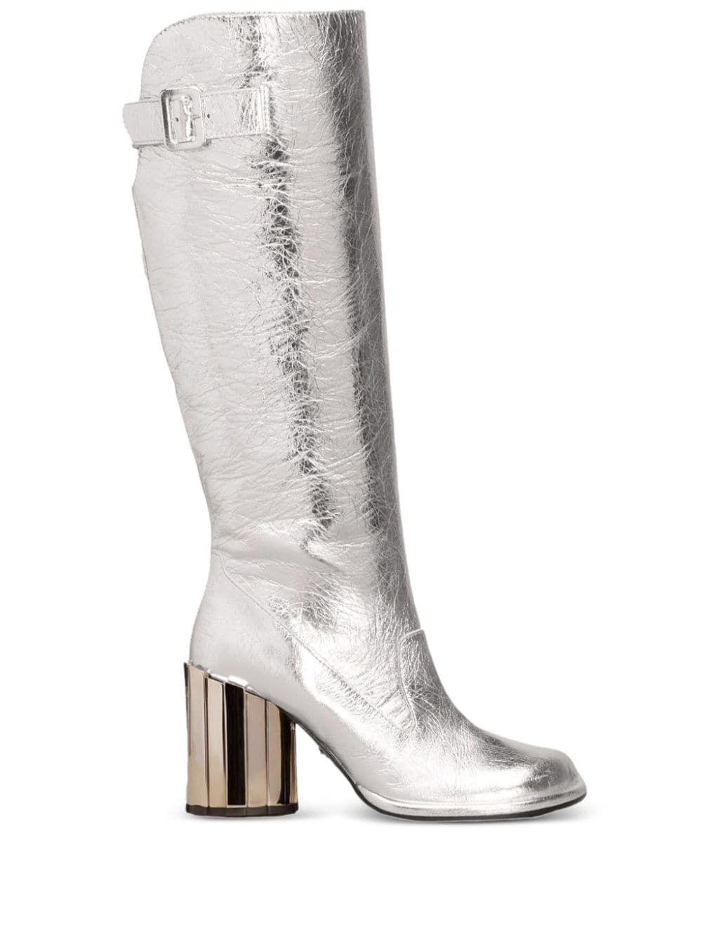 Anatomical-toe buckled boots Highlights - Silver-tone - Calf leather - Metallic effect - Crinkled finish - Round toe - Side buckle fastening - Mid block heel Imported Composition Lining: Fabric 100% Sole: Calf Leather 100% Outer: Calf Leather 100% SIZE & FIT Measurement HEEL 3.54 in(9 cm)
