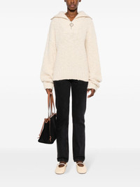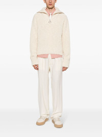 brushed half-zip jumper Alexandre Mattiussi goes back to his foundational roots with this ivory AMI Paris jumper – it’s inspired by the pieces he dreamed of making when he began designing 12 years ago. It’s brushed after being ribbed knit for a tactile finish and topped with an exaggerated point collar. Highlights - Ivory white - Merino wool blend - Ribbed knit - Brushed finish - Oversized pointed collar - Half front zip fastening - Drop shoulder - Long sleeves - Straight hem - When buying this unisex item, keep in mind that it is graded in standard men's sizing. Made in Italy Composition Wool 96%, Polyamide 4%