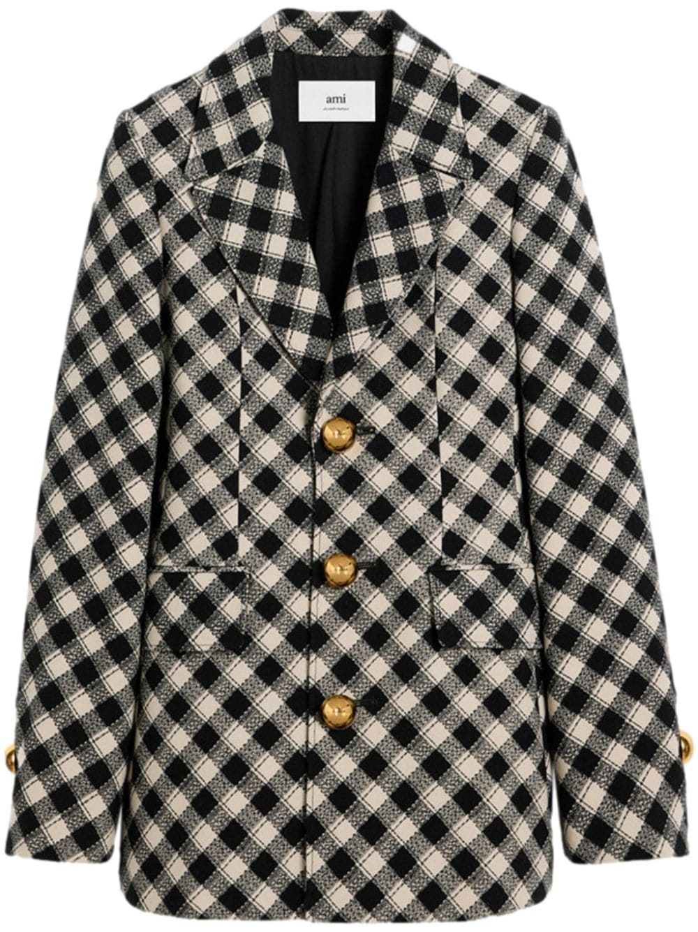 check-pattern jacket Highlights - Black/white - Wool - V-neck - Gold-tone buttons - Two side flap pockets - Long sleeves - Straight hem Imported Composition Wool 100%