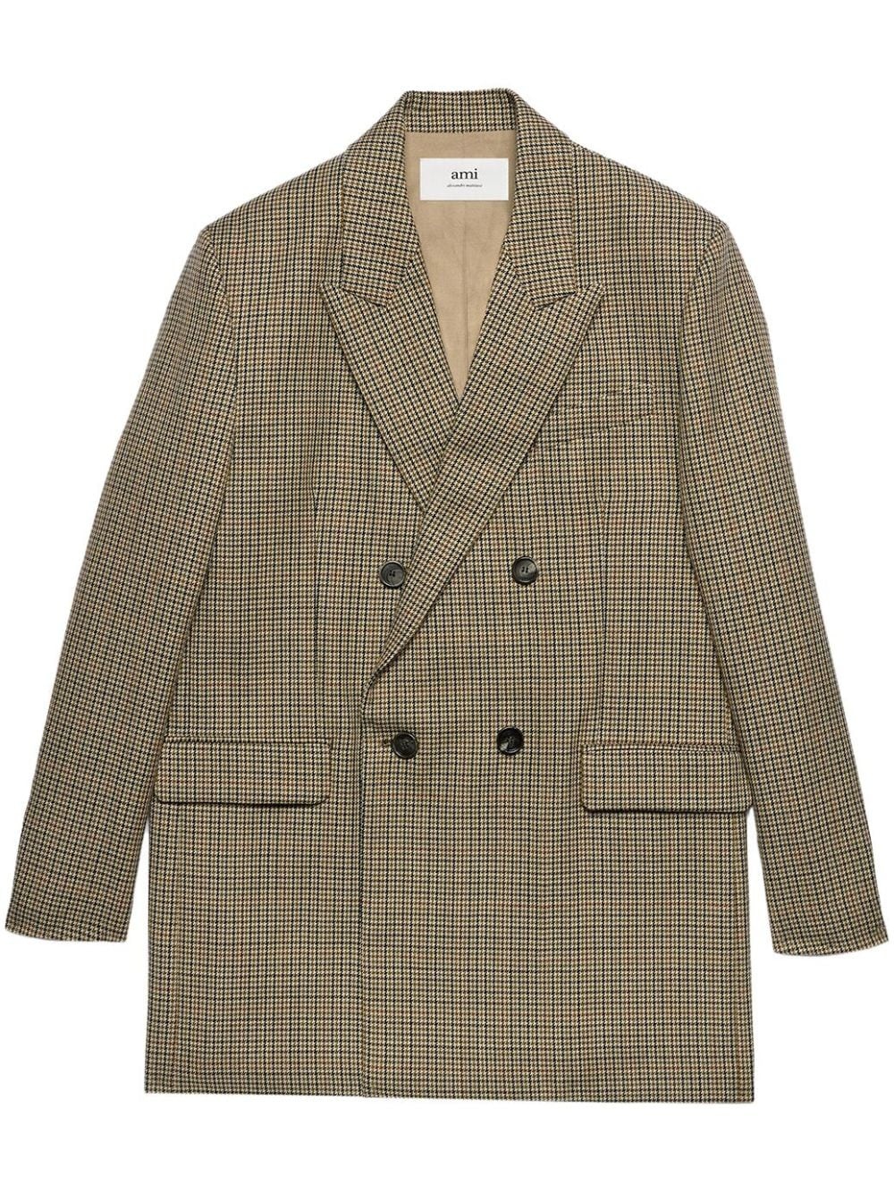 check-print double-breasted blazer AMI Paris' natural affinity for confident, easy dressing is masterfully captured in the bold construction of this check blazer. Riffing on a classic single-breasted silhouette, the oversized silhouette is fitted with tonal buttons and multiple pockets. Highlights - Beige - Wool - Check print - Peak lapels - Shoulder pads - Chest welt pocket - Long sleeves - Front button fastening - Two side flap pockets - Buttoned cuffs Imported Composition Wool 100%