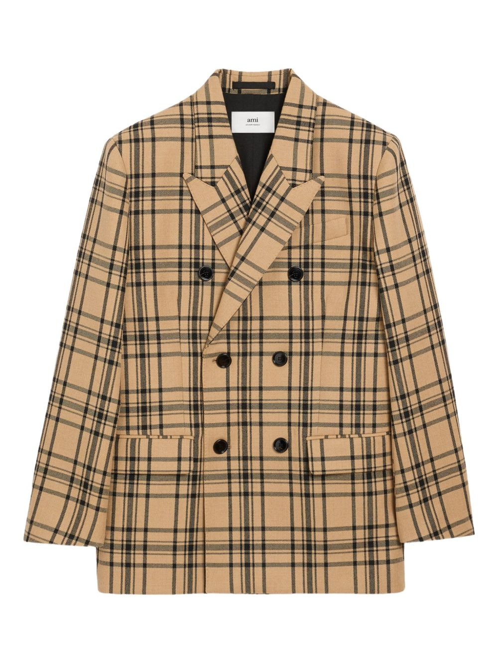 checked double-breasted blazer Highlights - Camel brown - Checked pattern - Double-breasted button fastening - Front flap pockets - Back slits Imported Composition Lining: Cotton 50%, Polyester 50% Outer: Wool 100% Washing instructions Read Manufacturer Guidelines
