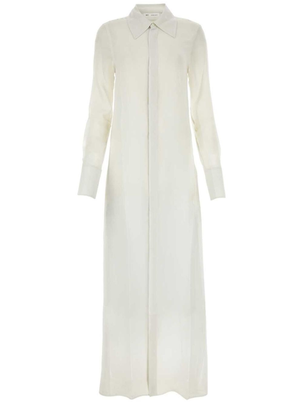 chiffon silk maxi dress Highlights - Cream white - Silk - Chiffon crepe - Semi-sheer construction - Pleat detailing at the sleeves - Oversized pointed collar - Long sleeves with buttoned cuffs - Side slits - Concealed front button fastening - Long length - Straight hem - Unlined Imported Composition Silk 100%