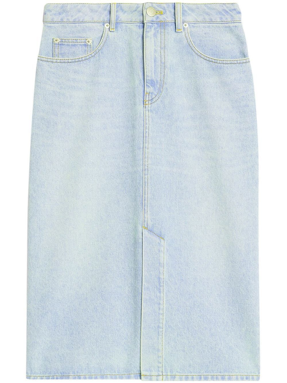 denim pencil midi skirt Cut for a straight silhouette and mid-length, this AMI Paris cotton denim skirt sits high on the waist. Finishing touches come in the form of a faded effect and contrast topstitching. Imported Composition Cotton 100% Washing instructions Read Manufacturer Guidelines