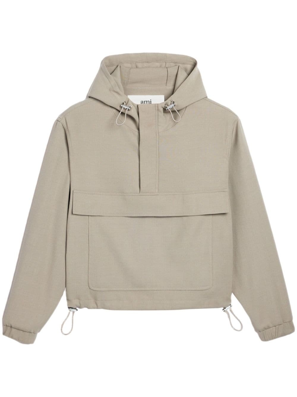 hooded windbreaker Highlights - Taupe - Drawstring hood - Short front button fastening - Drop shoulder - Long sleeves - Elasticated cuffs - Front pouch pocket - Drawstring hem - When buying this unisex item, keep in mind that it is graded in standard men's sizing. Imported Composition Viscose 55%, Virgin Wool 45% Washing instructions Read Manufacturer Guidelines