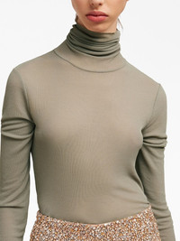 roll-neck ribbed sweater Highlights - Taupe brown - Ribbed knit - High neck - Fitted waistline - Extra-long sleeves - Straight hem Imported Composition Viscose 82%, Polyamide 18% Washing instructions Read Manufacturer Guidelines