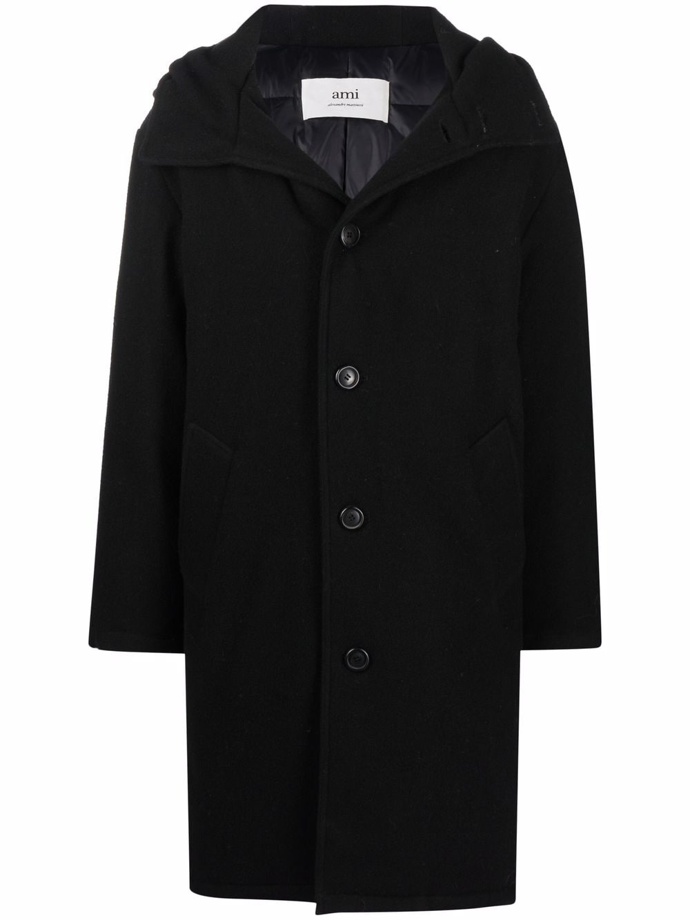 hooded single-breasted coat AMI Paris continues to pride themselves in creating wardrobe pieces that don't subscribe to seasonal trends. This hooded coat demonstrates the brand's focus with its versatile black shade along with a classic single-breasted silhouette. Imported Composition Wool 100% SIZE & FIT Model measurements Height 6 ft 1 in(1.85 m) Bust/Chest 37.79 in(96 cm) Hips 37.4 in(95 cm) Waist 30.7 in(78 cm) FittingInformation This piece fits true to size. We recommend you get your regular size Cut for a loose fit Made with a mid-weight non-stretch fabric