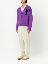 Ami de Coeur wool cardigan AMI Paris' signature Ami de Coeur logo, translating as 'Ami of hearts', is a reinterpretation of the ace of hearts, expressing the brand's playful nature. Spun from soft virgin wool, this cardigan features the motif at the chest in contrasting black against its lively purple construction. Highlights - Purple - Virgin wool - Signature ami de coeur monogram motif - Intarsia-knit logo - V-neck - Front button fastening - Long sleeves - Straight hem - Ribbed trim - When buying this unisex item, keep in mind that it is graded in standard men's sizing. Imported Composition Virgin Wool 100% Washing instructions Read Manufacturer Guidelines