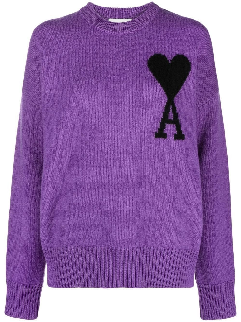 Ami de Coeur sweater AMI Paris' signature Ami de Coeur logo, translating as 'Ami of hearts', is a reinterpretation of the ace of hearts, expressing the brand's playful nature. Spun from soft virgin wool, this jumper features the motif at the chest in contrasting black against its lively purple construction. Highlights - Purple - Virgin wool - Signature ami de coeur monogram motif - Intarsia-knit logo - Crew neck - Long sleeves - Straight hem - Ribbed trim - When buying this unisex item, keep in mind that it is graded in standard men's sizing. Imported Composition Virgin Wool 100%