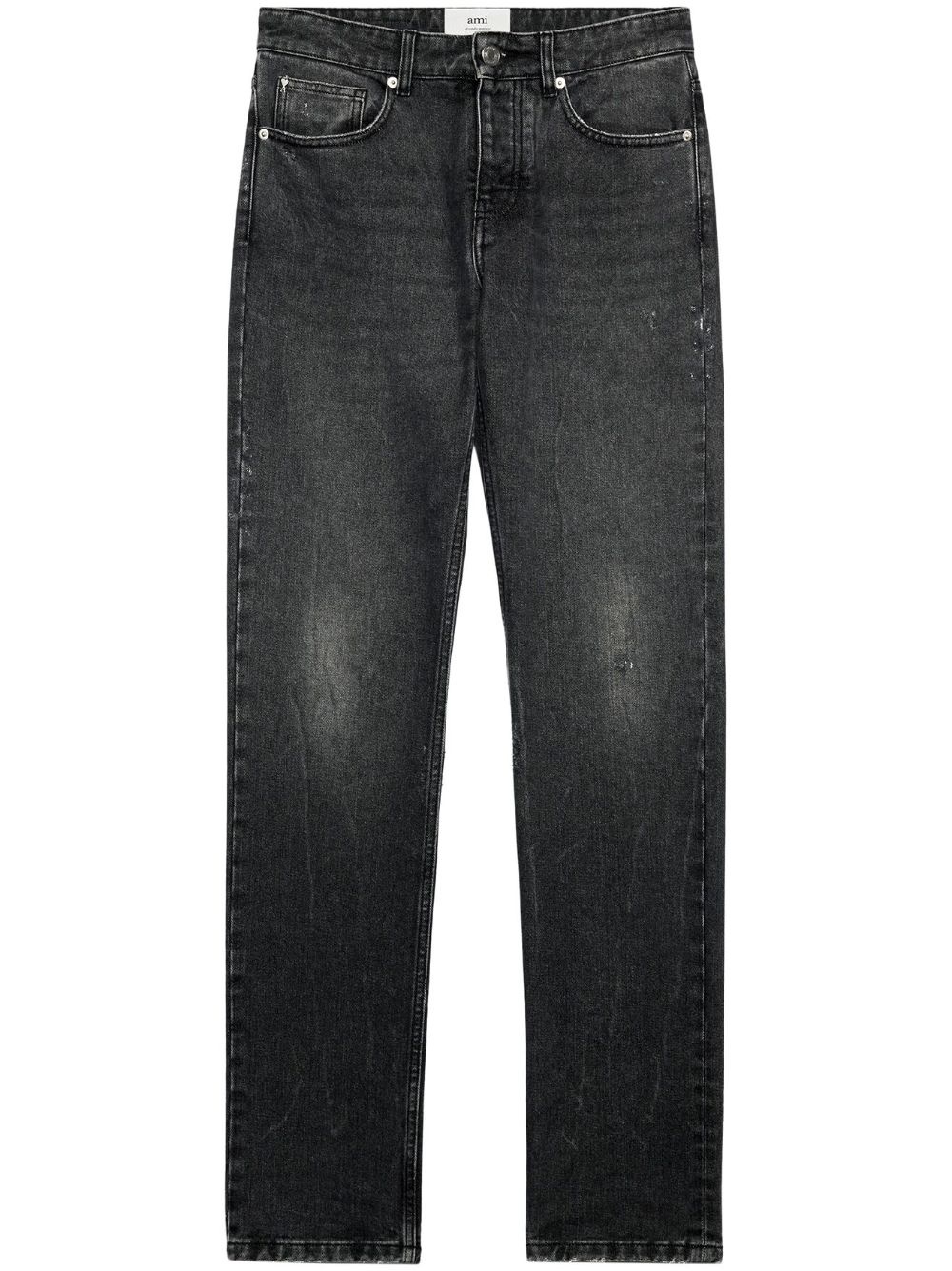 logo-patch straight-leg jeans AMI Paris' logo highlights these black straight-leg jeans from the brand's AW23 collection - appearing on the back, in light brown. This model is crafted from cotton and features a mid-washed effect and ripped details throughout. Highlights - Black - Cotton - Logo patch to the rear - Mid-rise - Belt loops - Front button fastening - Classic five pockets - Straight leg Imported Composition Cotton 100%