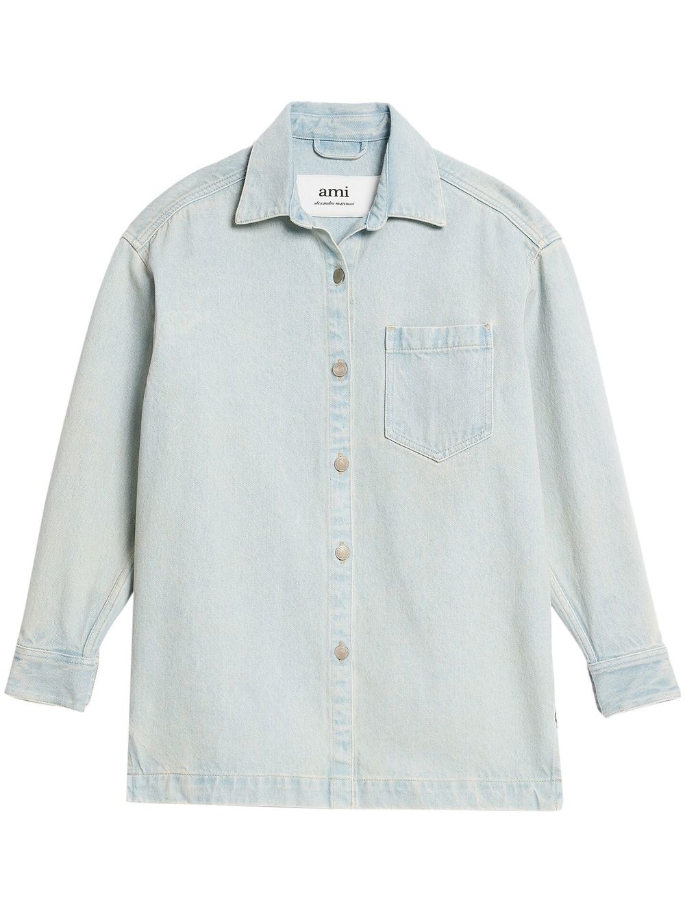 logo-print denim overshirt light blue cotton bleach wash crest motif logo print to the rear classic collar front button fastening front patch pocket long sleeves buttoned cuffs straight hem When buying this unisex item, keep in mind that it is graded in standard men's sizing. Imported Composition Cotton 100% Washing instructions Read Manufacturer Guidelines