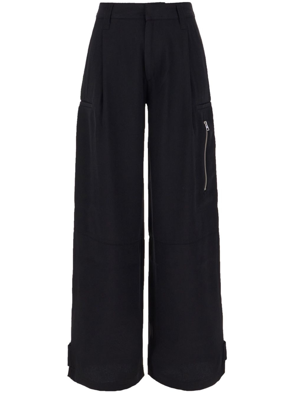 straight-leg cargo pants Highlights - Black - Straight leg - Pressed crease - Low-rise - Concealed front zip fastening - Belt loops - Two side slit pockets - Two rear jetted pockets - Side zip-fastening pocket - Belted cuffs Imported Composition Acetate 73%, Viscose 27%
