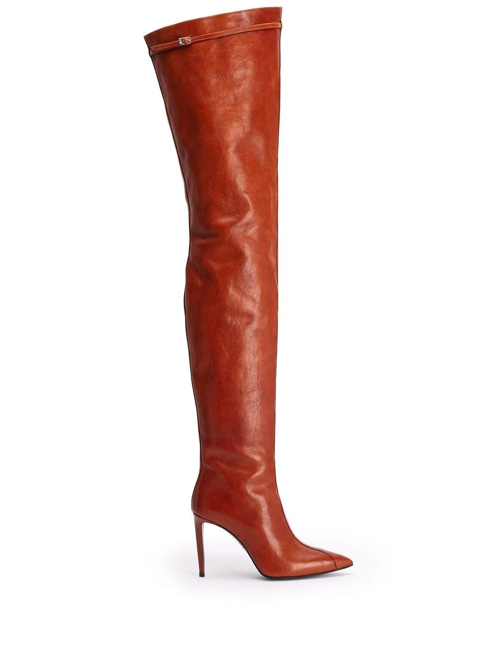over-the-knee leather boots These AMI Paris boots are crafted from smooth calf leather to a slip-on silhouette that hits above the knee. They're detailed with buckled straps at the openings and fitted with towering stiletto heels. Highlights - Brown - Calf leather - Pointed toe - Side buckle fastening - Stiletto heel Made in Italy Composition Outer: Calf Leather 100% Lining: Calf Leather 100% Sole: Calf Leather 100%