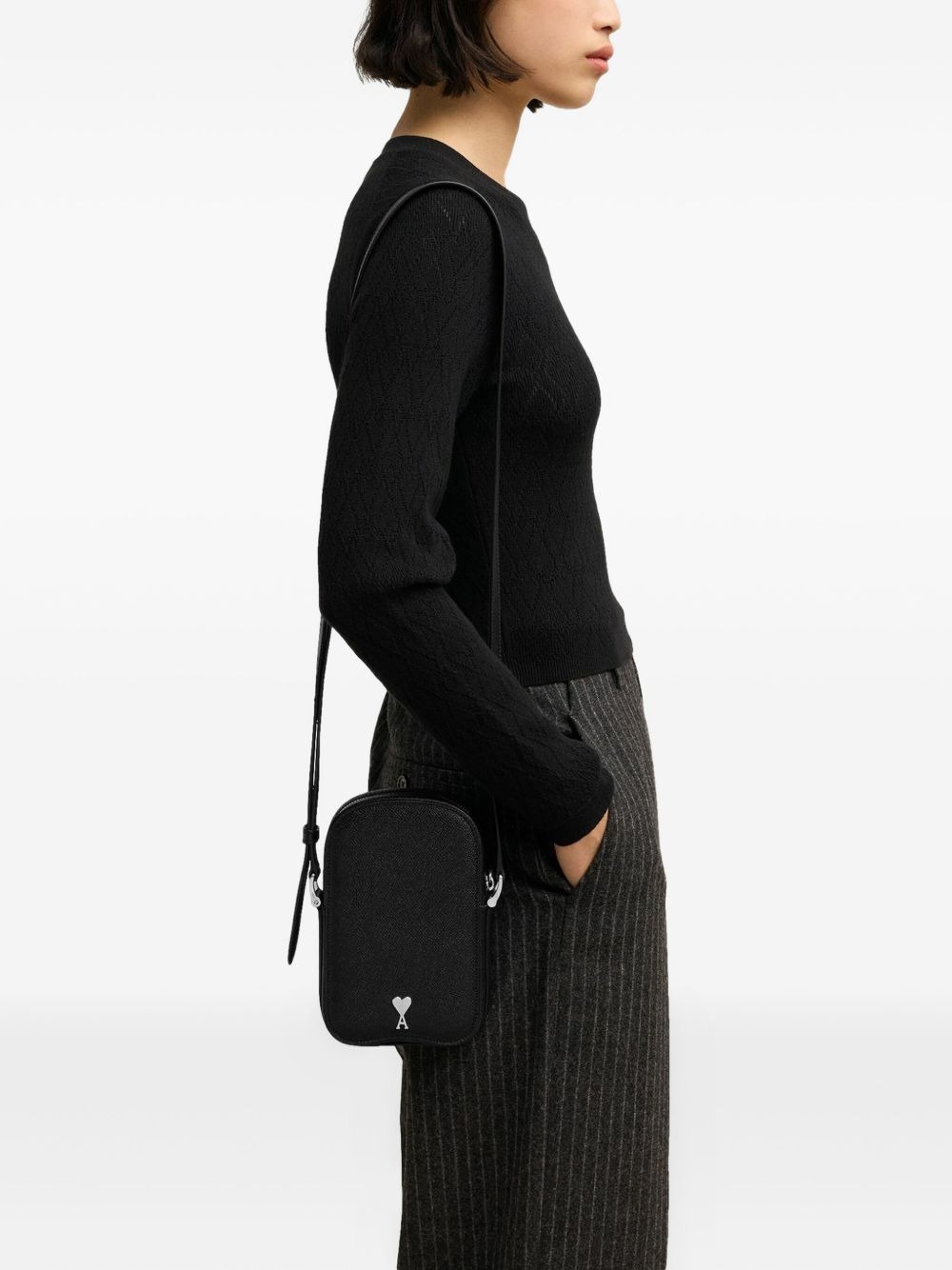Paris Paris Vertical shoulder bag Highlights - Black - Saffiano leather - Top zip fastening - Adjustable shoulder strap - Stitched edge - Signature ami de coeur monogram motif - Slip pocket to the rear - Main compartment - Internal slip pocket - Internal logo patch Made in Italy Composition Outer: Calf Leather 100% Lining: Lamb Skin 100% SIZE & FIT Measurement DEPTH 1.57 in(4 cm) HEIGHT 7.48 in(19 cm) WIDTH 4.92 in(12.5 cm)
