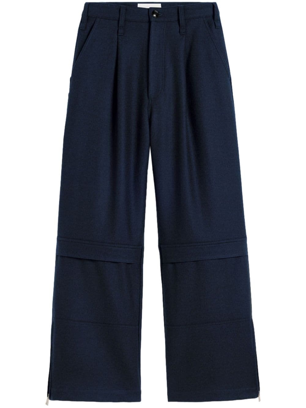 pleat-detailing wool trousers Highlights - Navy blue - Wool - Pleat detailing - Belt loops - Front button fastening - Two side slit pockets - Two rear jetted pockets - Wide leg Imported Composition Wool 100% Washing instructions Read Manufacturer Guidelines