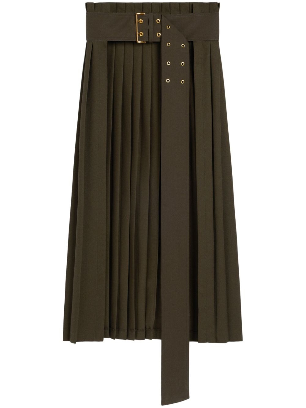 pleated skirt Highlights - Olive green - Buckle fastening - Belted waist - High-waisted - Mid-length Imported Composition Polyester 55%, Virgin Wool 45%