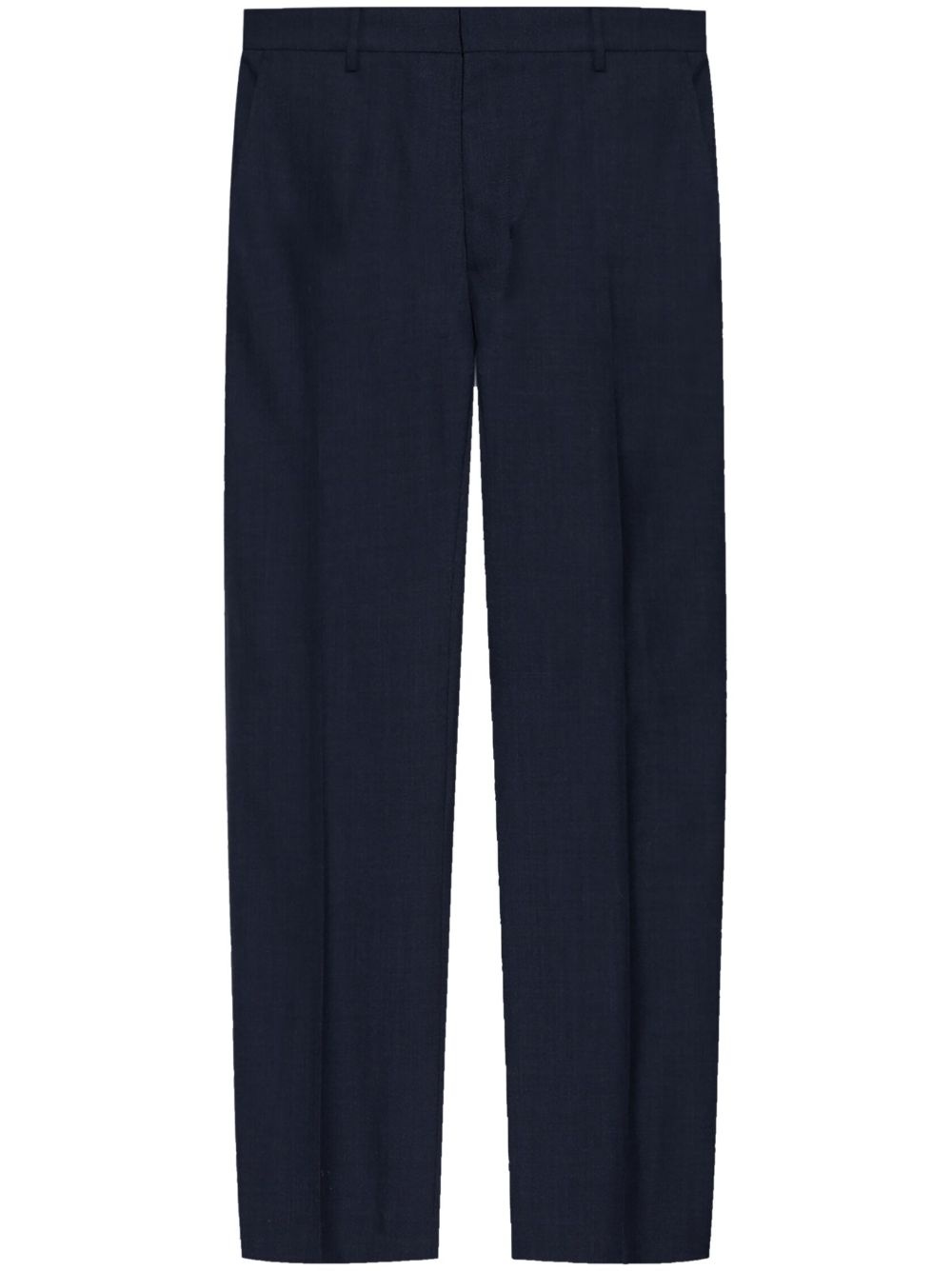 pressed-crease tapered trousers Highlights - Navy blue - Concealed front fastening - Two side slit pockets - Belt loops Imported Composition Virgin Wool 100% SIZE & FIT Measurement FRONT RISE 11.81 in(30 cm) INSIDE LEG 32.28 in(82 cm) HIPS 43.3 in(110 cm)