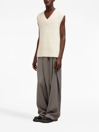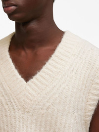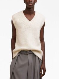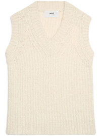 ribbed V-neck vest Woven in Italy from a textured blend of alpaca wool, this cream-hued vest from AMI Paris reflects the brand's timeless take on knitwear. Cut to a relaxed silhouette, the sleeveless design boasts a V-neck and a chunky ribbed construction throughout. Highlights - Cream white - Alpaca wool-blend - Chunky ribbed knit - V-neck - Sleeveless - Ribbed cuffs and hem - When buying this unisex item, keep in mind that it is graded in standard men's sizing. Made in Italy Composition Alpaca 74%, Wool 22%, Polyamide 4%