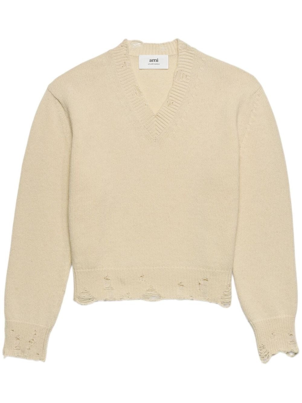 cut-out sweater Rendered in a light shade of beige, this V-neck jumper from AMI Paris is spun in Portugal from delicate wool and woven into a chunky knit design. A relaxed fit and ripped accents add a distressed appeal to its V-neck silhouette. Highlights - Light beige - Wool - Knitted construction - V-neck - Drop shoulder - Ripped detailing - Ribbed cuffs and hem - When buying this unisex item, keep in mind that it is graded in standard men's sizing. Imported Composition Wool 100% SIZE & FIT Measurement SLEEVE LENGTH 22.04 in(56 cm) LENGTH 21.25 in(54 cm) BUST 40.15 in(102 cm) Shoulder Width 17.32 in(44 cm)