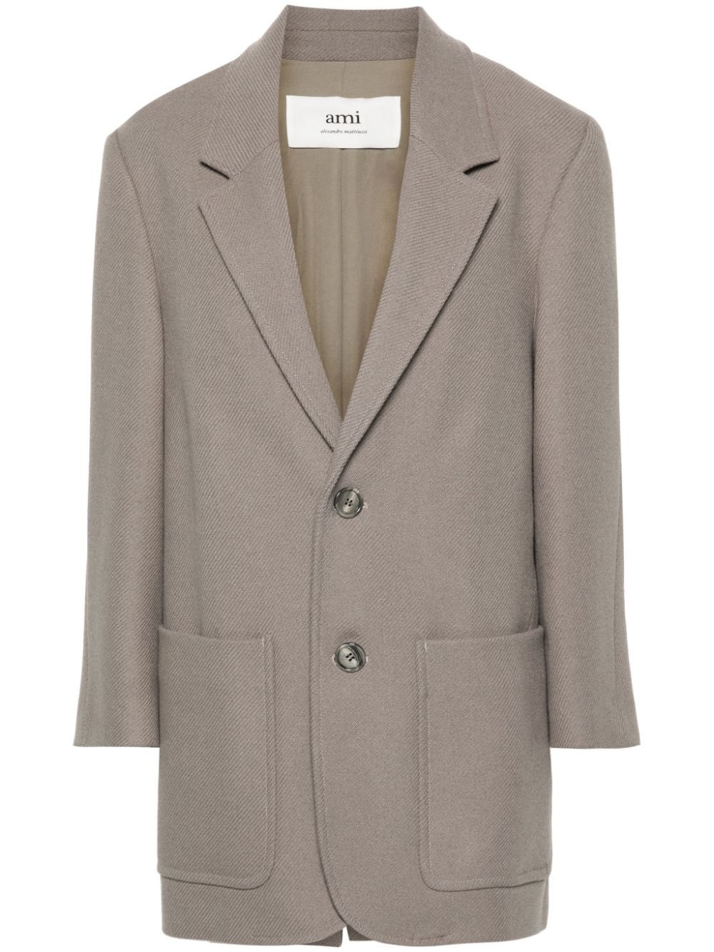 single-breasted coat Conceived as a 'brand for friends', AMI Paris offers stylish designs, blurring the boundaries between casual and sophistictaed. This single-breasted coat from the brand's SS24 collection features a taupe virgin-wool construction and a straight, relaxed cut. Highlights - Taupe grey - Virgin wool blend - Twill weave - Notched lapels - Long sleeves - Buttoned-cuff sleeves - Two front patch pockets - Central rear vent - Multiple internal slip pockets - Full lining - Front button fastening Imported Composition Outer: Virgin Wool 90%, Polyamide 10% Lining: Cotton 50%, Polyester 50%