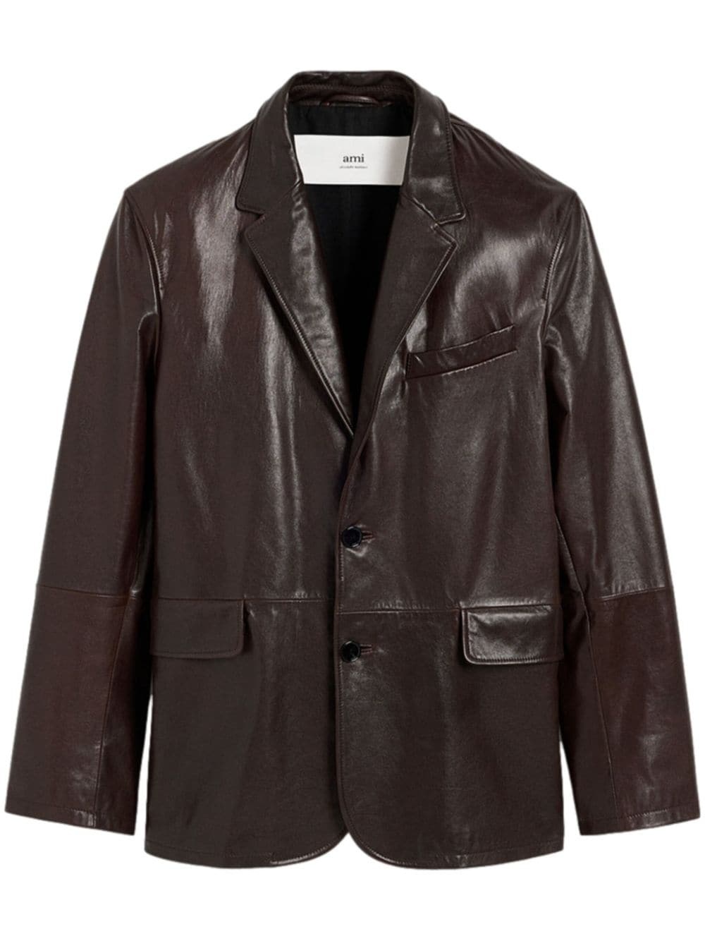 single-breasted leather blazer Highlights - Brown - Calf leather - Smooth grain - Panelled design - Chest welt pocket - Two front flap pockets - Notched lapels - Front button fastening - Long sleeves - Central rear vent Imported Composition Calf Leather 100%