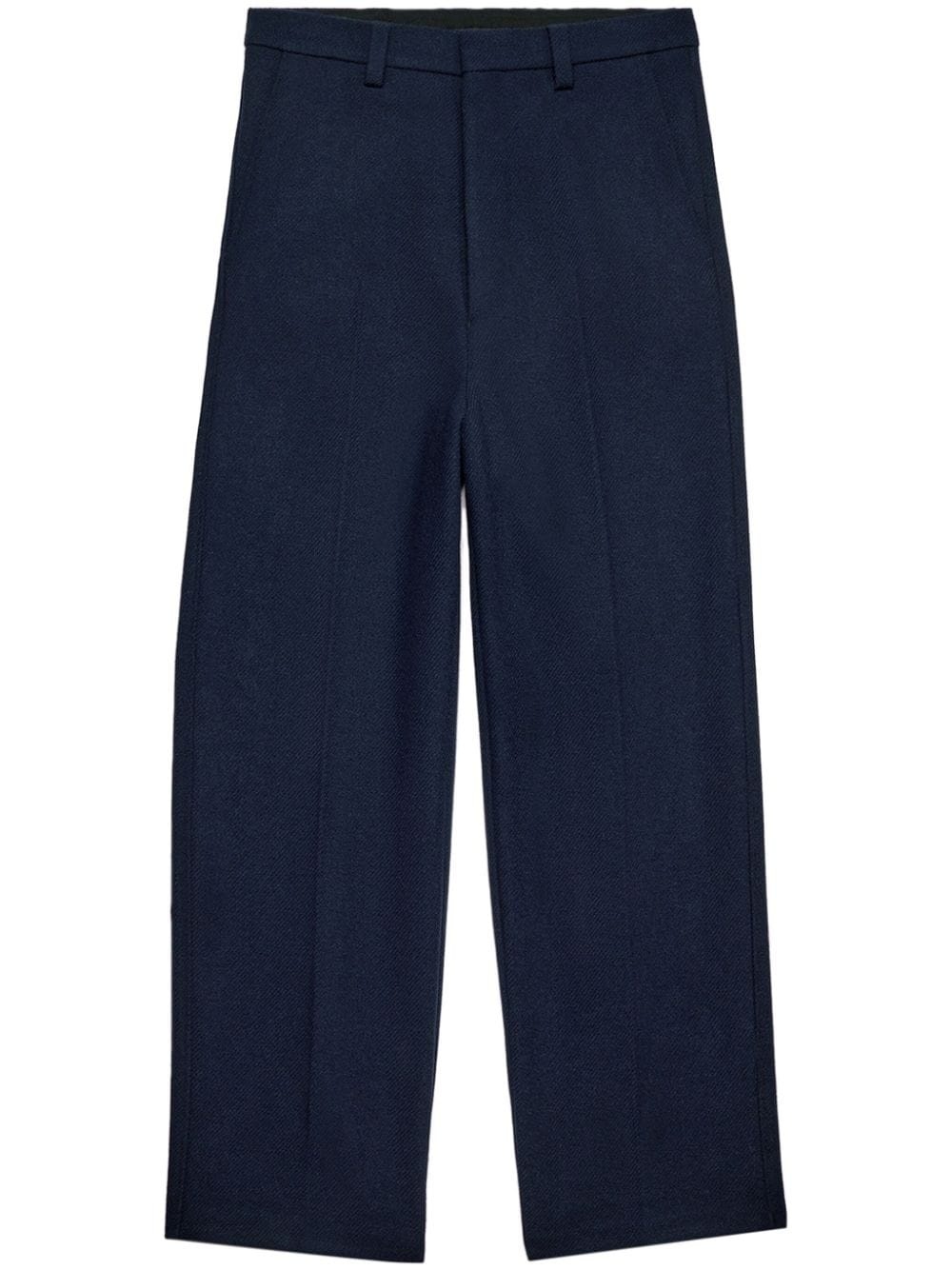 straight-leg tailored trousers Highlights - Navy blue - Wool blend - High waist - Belt loops - Hook and zip fly fastening - Two side inset pockets - Two rear button-fastening jetted pockets - Pressed crease - Straight leg Imported Composition Wool 90%, Polyamide 10% Washing instructions Dry Clean Only