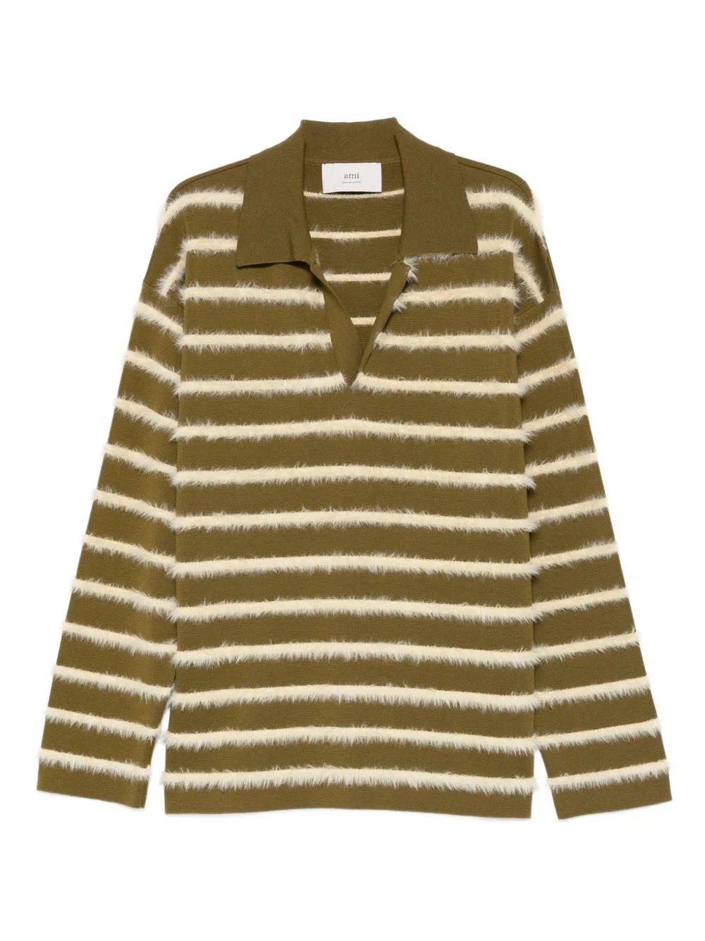 striped long-sleeve sweater Highlights - Olive green - Striped - Long sleeves - Polo collar - V-neck Imported Composition Merino 85%, Polyamide 15% SIZE & FIT Model measurements Height 6 ft 1 in(1.86 m) Bust/Chest 35.43 in(90 cm) Hips 35.03 in(89 cm) Waist 29.13 in(74 cm) Washing instructions Hand Wash