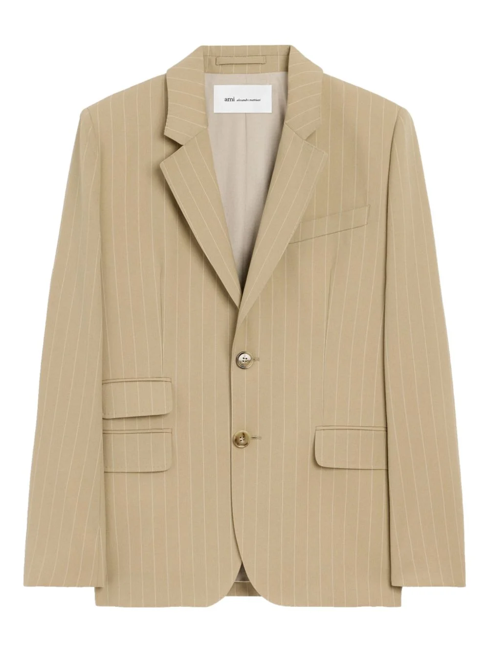 striped single-breasted blazer Highlights - Beige - Pinstripe pattern - Button fastening - Notched lapel - Chest welt pocket - Flap pockets Imported Composition Lining: Polyester 50%, Cotton 50% Outer: Wool 100% Washing instructions Dry Clean Only