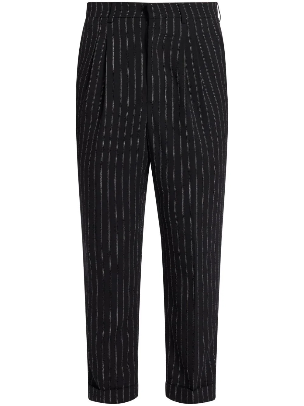 tapered-leg tailored trousers Highlights - Black/white - Virgin wool - Pinstripe pattern - Concealed front fastening - Belt loops - Two rear welt pockets - Tapered leg Imported Composition Virgin Wool 100% Washing instructions Read Manufacturer Guidelines