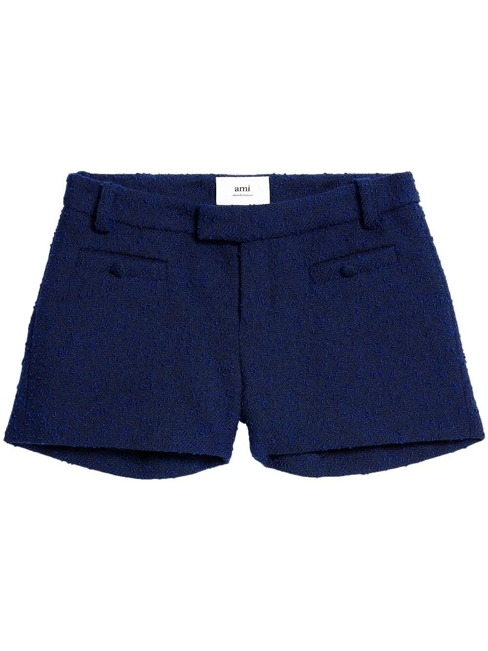 tweed tailored shorts indigo blue virgin wool blend/cotton blend tweed concealed side hook and zip fastening two front welt pockets belt loops straight hem thigh-length tailored design Imported Composition Virgin Wool 45%, Polyester 44%, Cotton 6%, Polyamide 5%