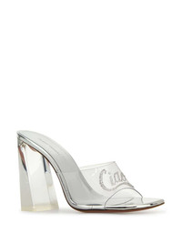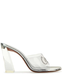 95mm Bella mules Highlights - Silver-tone/transparent design - Calf leather - Slip-on style - 95mm transparent block heel - Rhinestone embellishment - Almond open toe - Branded leather insole Made in Italy Composition PVC 100% SIZE & FIT Measurement HEEL 3.75 in(9.5 cm)
