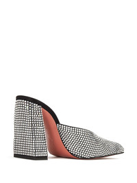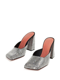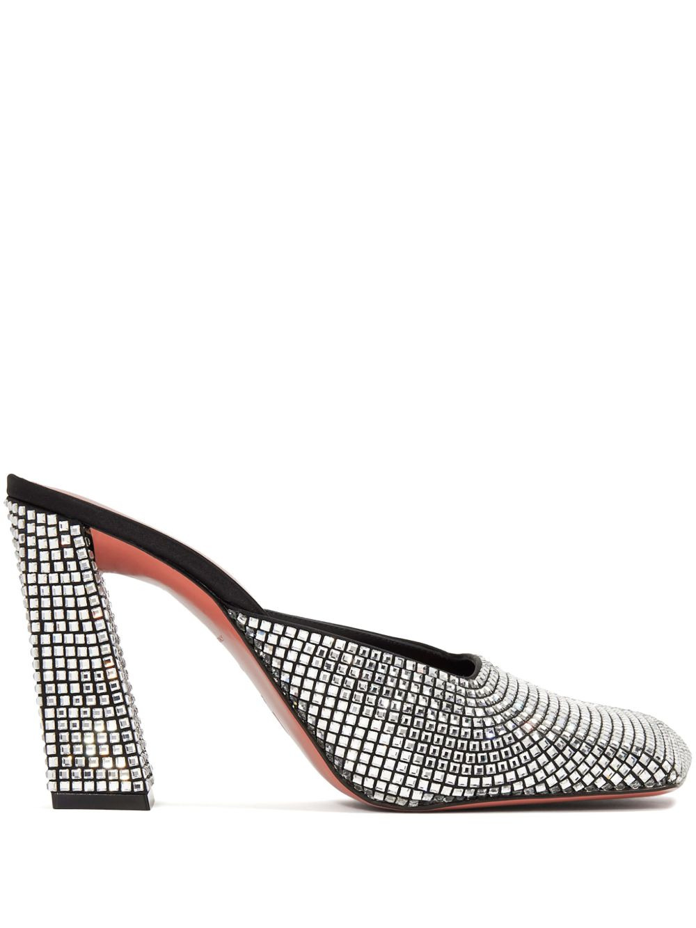 95mm Charlotte Crystal Mules Highlights - Silver-tone - Calf leather - Crystal-embellished satin - Asymmetric square toe - Block heel Made in Italy Composition Lining: Calf Leather 100% Outer: Satin 100%, Crystal 100% Sole: Calf Leather 100% SIZE & FIT Measurement HEEL 3.74 in(9.5 cm)