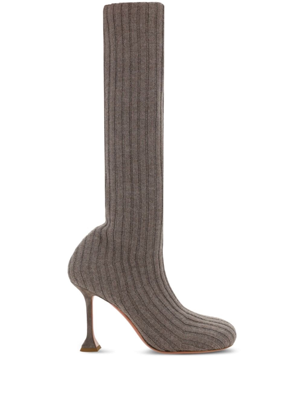 95mm Veneda boots Highlights - Almond beige - Stretch-wool - Ribbed knit - Pull-on style - 95mm sculpted heel - Round toe - Knee-length - Branded leather insole - Rubber sole Made in Italy Composition Outer: Wool 90%, Elastane 10% Sole: Calf Leather 70%, Rubber 30% Lining: Fabric 100%
