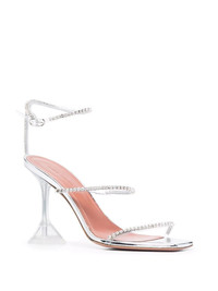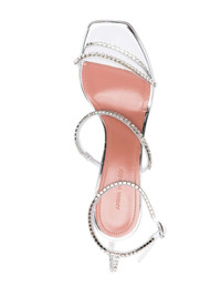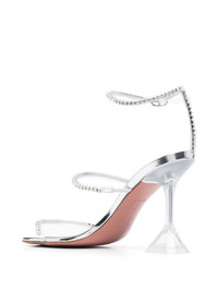 Gilda open-toe sandals Amina Muaddi's signature part-stiletto, part-flared heel is showcased in these Gilda open-toe sandals. Available in many iterations, this design has a silver metallic finish and crystal embellished straps that reflects the brand's balance of drama and sophistication. Made in Italy Composition PVC 100% SIZE & FIT Measurement HEEL 3.93 in(10 cm) CIRCUMFERENCE 8.66 in(22 cm) HEIGHT 2.36 in(6 cm)