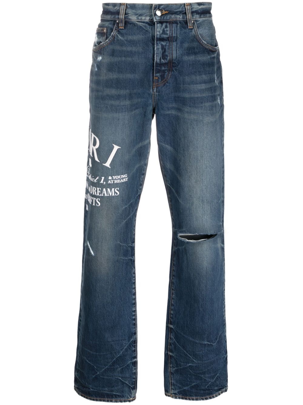 Arts District straight-leg jeans AMIRI takes an artful approach to classic denim in the Arts District jeans. They're printed with a bold contrasting logo at the straight leg and detailed with distressed knees and fading throughout. Highlights - Indigo blue - Cotton - Logo print to the front - Ripped detailing - Mid-rise - Belt loops - Front button fastening - Classic five pockets - Straight leg Made in Italy Composition Cotton 100% SIZE & FIT Model measurements Height 6 ft 0 in(1.84 m) Bust/Chest 34.64 in(88 cm) Hips 35.03 in(89 cm) Waist 27.95 in(71 cm) FittingInformation Designed with a straight leg, these jeans allow for an unrestricted and comfortable fit over the leg Sturdy and hard-wearing, this denim piece offers no stretch This piece fits true to size – take your usual size Measurement INSIDE LEG 35 in(88.9 cm) Hem Width 15.98 in(40.6 cm) FRONT RISE 12 in(30.5 cm) WAIST 32.99 in(83.8 cm) BACK RISE 14.01 in(35.6 cm) HIPS 40 in(101.6 cm) Washing instructions Dry Clean Only
