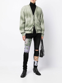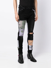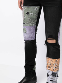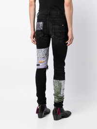Bandana Art jeans Colourful quilted patches take the focus on these AMIRI slim-fit jeans. Made from a cotton blend in the USA, this distressed-effect pair features a classic five-pocket design. Highlights - Black - Concealed fly and button fastening - Belt loops - Classic five pockets - Patchwork detailing Made in United States Composition Cotton 92%, Polyester 6%, Elastane 2% SIZE & FIT Model measurements Height 6 ft 2 in(1.87 m) Bust/Chest 34.25 in(87 cm) Hips 36.22 in(92 cm) Waist 29.52 in(75 cm) Washing instructions Dry Clean Only