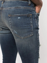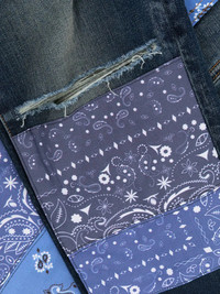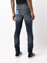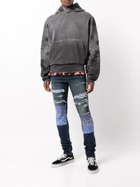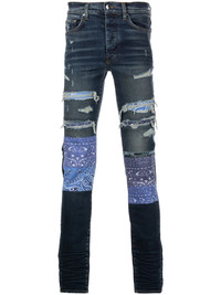 Bandana Artpatch skinny jeans blue cotton blend distressed effect patchwork design whiskering effect at the thighs ripped detailing bandana print button fly fastening belt loops classic five pockets skinny cut Made in United States Composition Body: Cotton 92%, Elastane 8% Washing instructions Dry Clean Only