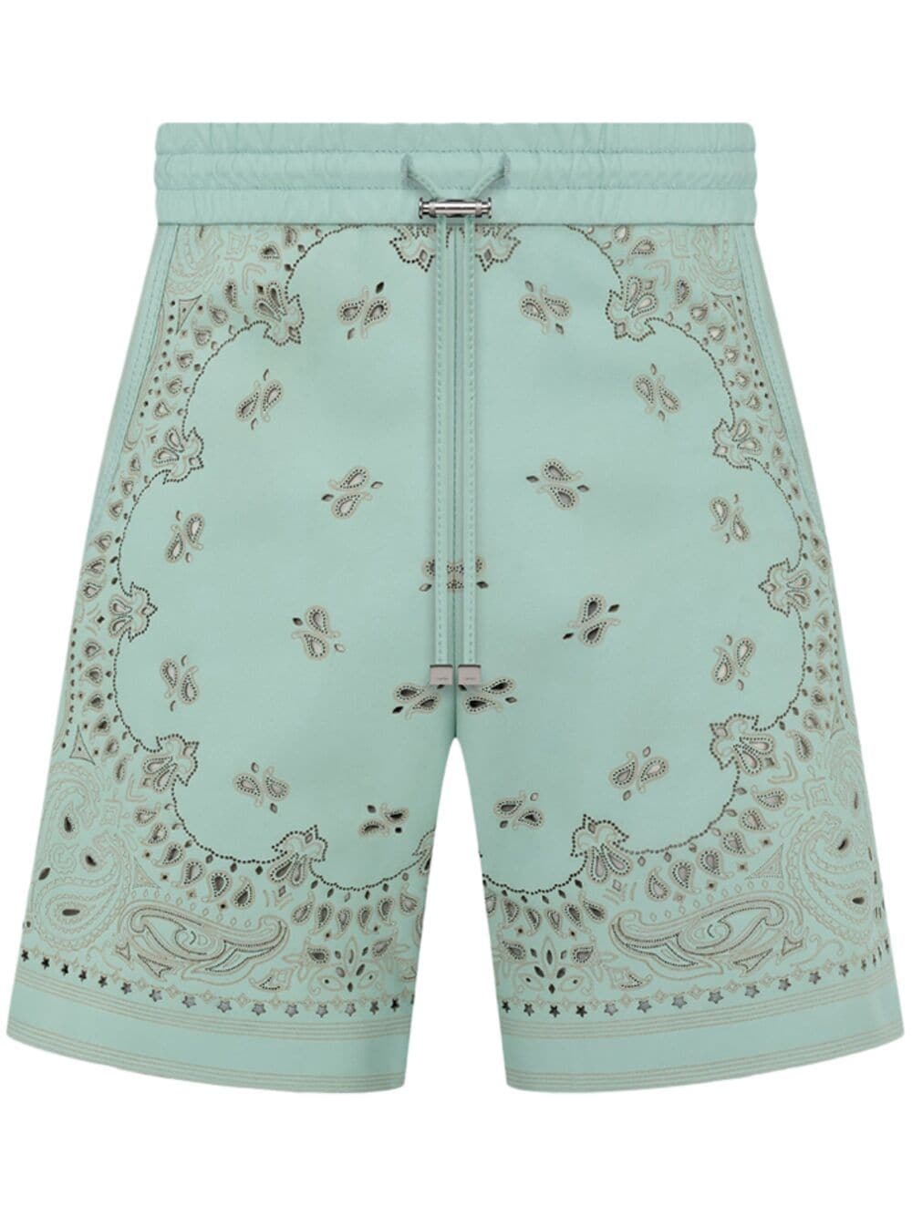 bandana-print leather shorts Highlights - Mint green - Leather - Bandana print - Logo patch to the rear - Elasticated drawstring waistband - Above-knee length Imported Composition Leather 100% SIZE & FIT Measurement INSIDE LEG 5.98 in(15.2 cm) BACK RISE 14.01 in(35.6 cm) HIPS 37.99 in(96.5 cm) Hem Width 25 in(63.5 cm) WAIST 30.98 in(78.7 cm)