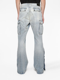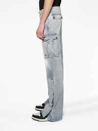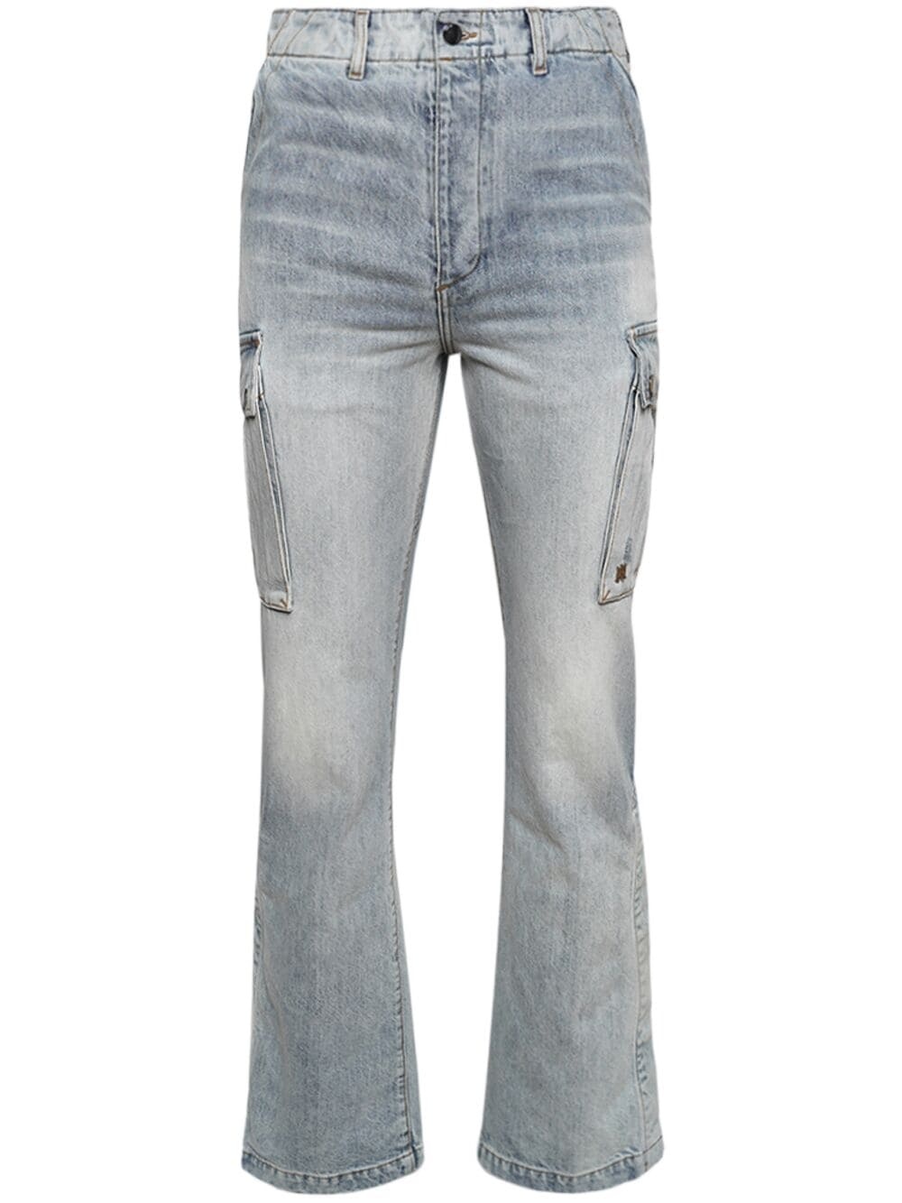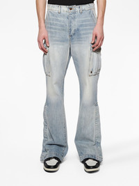 cargo flared jeans Crafted from faded cotton, these jeans from Amiri are imagined in a light blue colourway. Sitting at a mid-rise, the pair is cut to a flared silhouette for SS23 and adorned with utilitarian cargo pockets. Highlights - Light blue - Cotton - Faded effect - Mid-rise - Multiple cargo pockets - Front button and zip fastening - Classic five pockets - Flared Made in United States Composition Cotton 100%