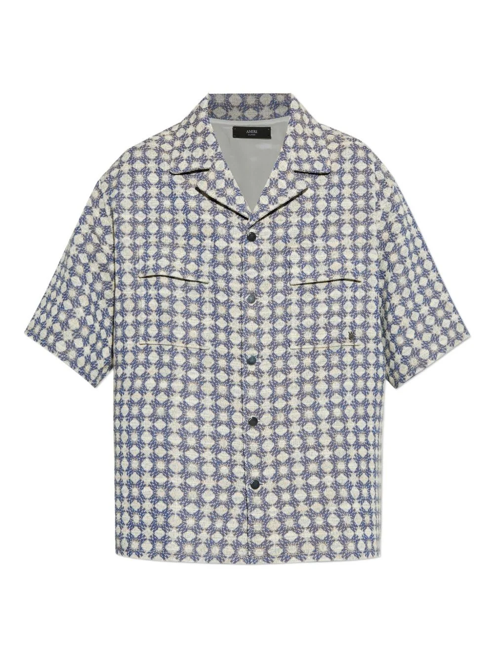 checked short-sleeve shirt Highlights - Blue and white - Geometric print - Button fastening - Patch pockets - Notched collar Made in Italy Composition Cotton 39%, Polyester 28%, Virgin Wool 24%, Nylon 9% Washing instructions Read Manufacturer Guidelines