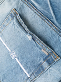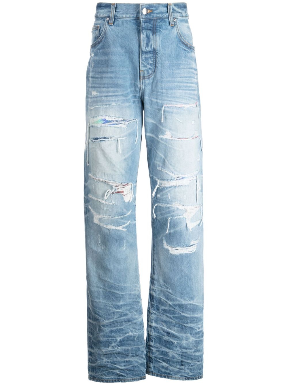 distressed lose-fit jeans Highlights - Blue - Cotton - Denim - Distressed finish - Embroidered logo to the rear - Straight leg - Belt loops - Button fly fastening - Classic five pockets Made in United States Composition Cotton 100% SIZE & FIT Model measurements Height 6 ft 2 in(1.87 m) Bust/Chest 36.22 in(92 cm) Hips 37.79 in(96 cm) Waist 28.34 in(72 cm) FittingInformation Designed with a straight leg, these jeans allow for an unrestricted and comfortable fit over the leg Constructed from stretch denim, this piece offers a stretch fit with durability This piece fits true to size – take your usual size Washing instructions Dry Clean Only