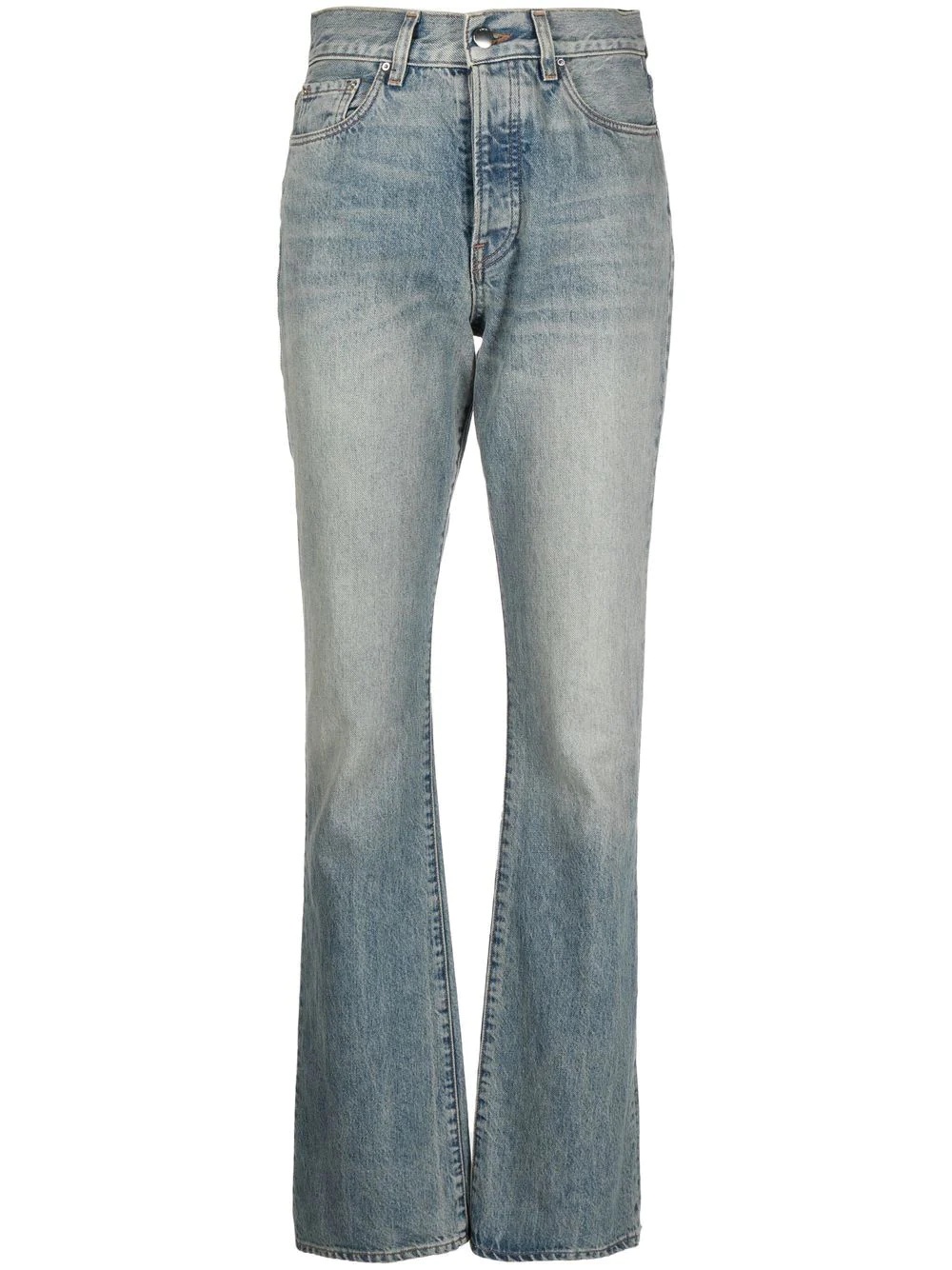 high-waist bootcut jeans blue cotton washed logo patch to the rear high waist belt loops front button and zip fastening classic five pockets Made in United States Composition Cotton 100% SIZE & FIT Model measurements Height 5 ft 9 in(1.75 m) Bust/Chest 32.67 in(83 cm) Hips 36.22 in(92 cm) Waist 24.8 in(63 cm) FittingInformation This piece fits true to size. We recommend you get your regular size Designed to be fitted at the waist and through the thigh, loose from the knee Made with a mid-weight non-stretch fabric Washing instructions Machine Wash