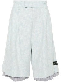 layered bermuda shorts Highlights - Light blue - Cross hatch texture - Melange effect - Belt loops - Two side slash pockets - Pleat detailing to the front - Logo patch to the front - Layered details to the hem - Lurex detailing to the underlayer - Below-knee length - Two rear welt pockets - Full lining - Concealed front button, hook and zip fastening Made in Italy Composition Outer: Wool 47%, Cotton 39%, Polyamide 14% Lining: Viscose 100% Washing instructions Dry Clean Only