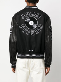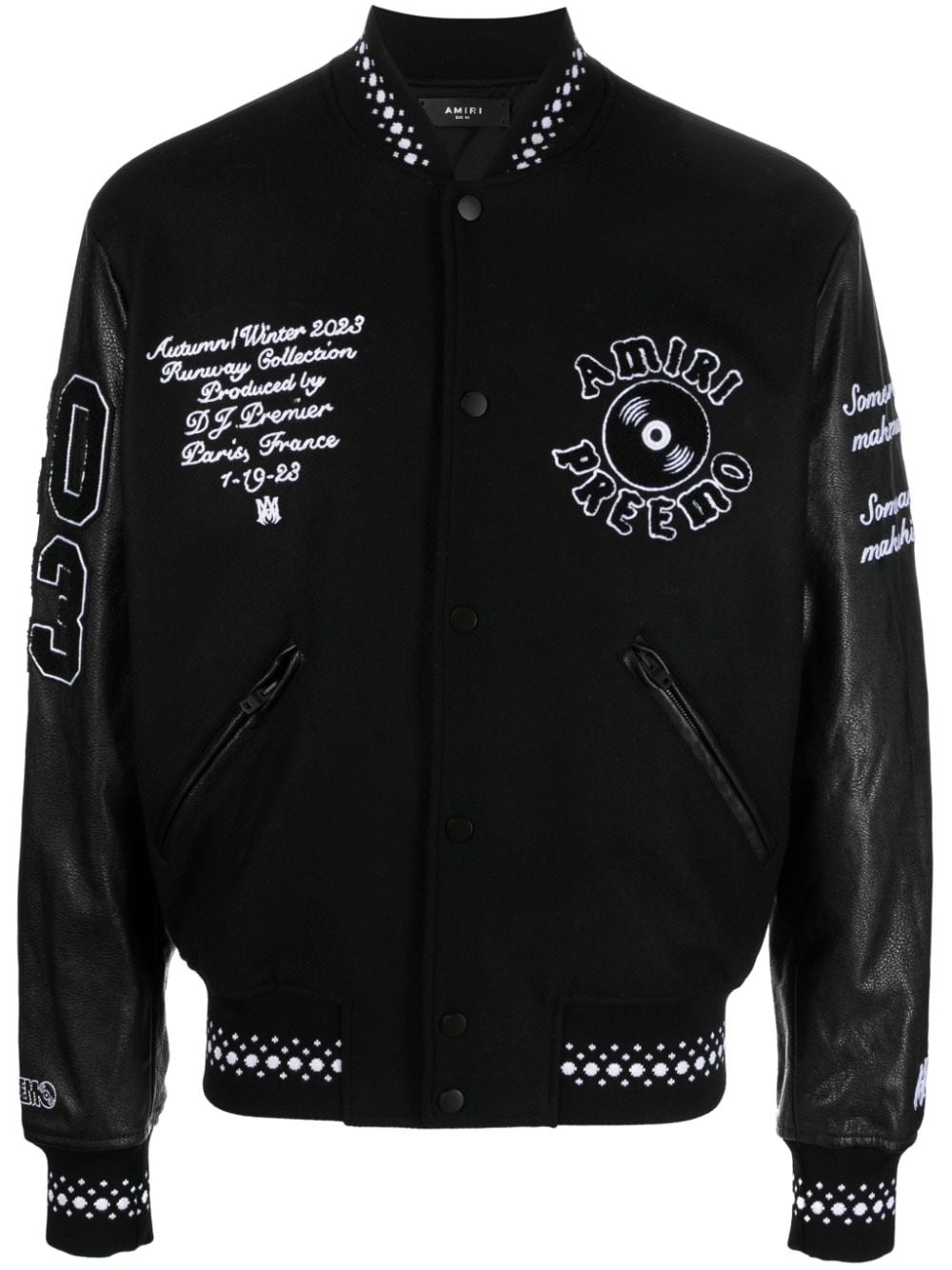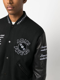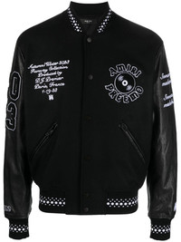 logo-applique varsity jacket AMIRI's varsity jacket is crafted from a soft wool blend with leather sleeves. The sports-inspired design is artfully appliqued with playful logo patches throughout and is finished with striped trims. Highlights - Black/white - Wool blend - Calf leather - Applique logo - Ribbed band collar - Front press-stud fastening - Long sleeves - Two side zip-fastening pockets - Ribbed cuffs and hem Made in Italy Composition Outer: Wool 75%, Polyamide 25% Lining: Viscose 100%, Calf Leather 100% SIZE & FIT Model measurements Height 6 ft 1 in(1.85 m) Bust/Chest 38.58 in(98 cm) Hips 37 in(94 cm) Waist 30.31 in(77 cm) Measurement SLEEVE LENGTH 34.64 in(88 cm) FittingInformation Designed to be unstructured, offering a loose fit throughout The ribbed hem offers a close, comfortable fit Made from a midweight non-stretch fabric This piece fits true to size – take your usual size Washing instructions Dry Clean Only