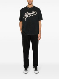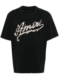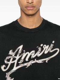 logo-printed cotton T-shirt AMIRI's logo takes the focus of this short-sleeve T-shirt. The detail appears at the chest, adding contrasting against its black cotton construction. Highlights - Black/ecru - Cotton - Jersey texture - Faded effect - Logo print to the front - Crew neck - Drop shoulder - Short sleeves - Straight hem - Unlined Made in Italy Composition Cotton 100% SIZE & FIT Model measurements Height 6 ft 2 in(1.87 m) Bust/Chest 38.18 in(97 cm) Hips 36.61 in(93 cm) Waist 29.13 in(74 cm) FittingInformation Designed for a relaxed fit, this piece allows for comfort and movement when worn Made from a midweight non-stretch fabric, this piece offers minimal elasticity when worn This piece fits true to size – take your usual size Measurement CHEST 47 in(119.4 cm) LENGTH 25.98 in(66 cm) WAIST 45.98 in(116.8 cm) SLEEVE LENGTH 9.01 in(22.9 cm) Shoulder Width 20 in(50.8 cm) Washing instructions Dry Clean Only
