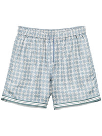 MA Quad shorts Highlights - Light steel blue/ecru/green - Silk - Satin finish - All-over monogram pattern - Elasticated drawstring waistband - Two side inset pockets - Logo print to the front - Stripe trim - Unlined - Above-knee length Made in Italy Composition Silk 100% SIZE & FIT Model measurements Height 6 ft 2 in(1.88 m) Bust/Chest 36.61 in(93 cm) Hips 35.82 in(91 cm) Waist 27.95 in(71 cm) FittingInformation Designed for relaxed fit, offering a comfortable loose fit over the leg The elasticated waist allows for a comfortable fit Made from a lightweight non-stretch fabric