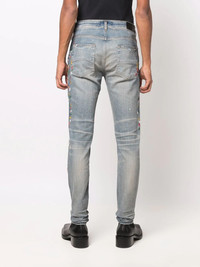 Painter skinny jeans blue cotton blend paint splatter detail ripped detailing super-skinny cut whiskering effect at the thighs belt loops zip fly fastening Made in United States Composition Cotton 92%, Polyester 6%, Spandex/Elastane 2% Washing instructions Dry Clean Only
