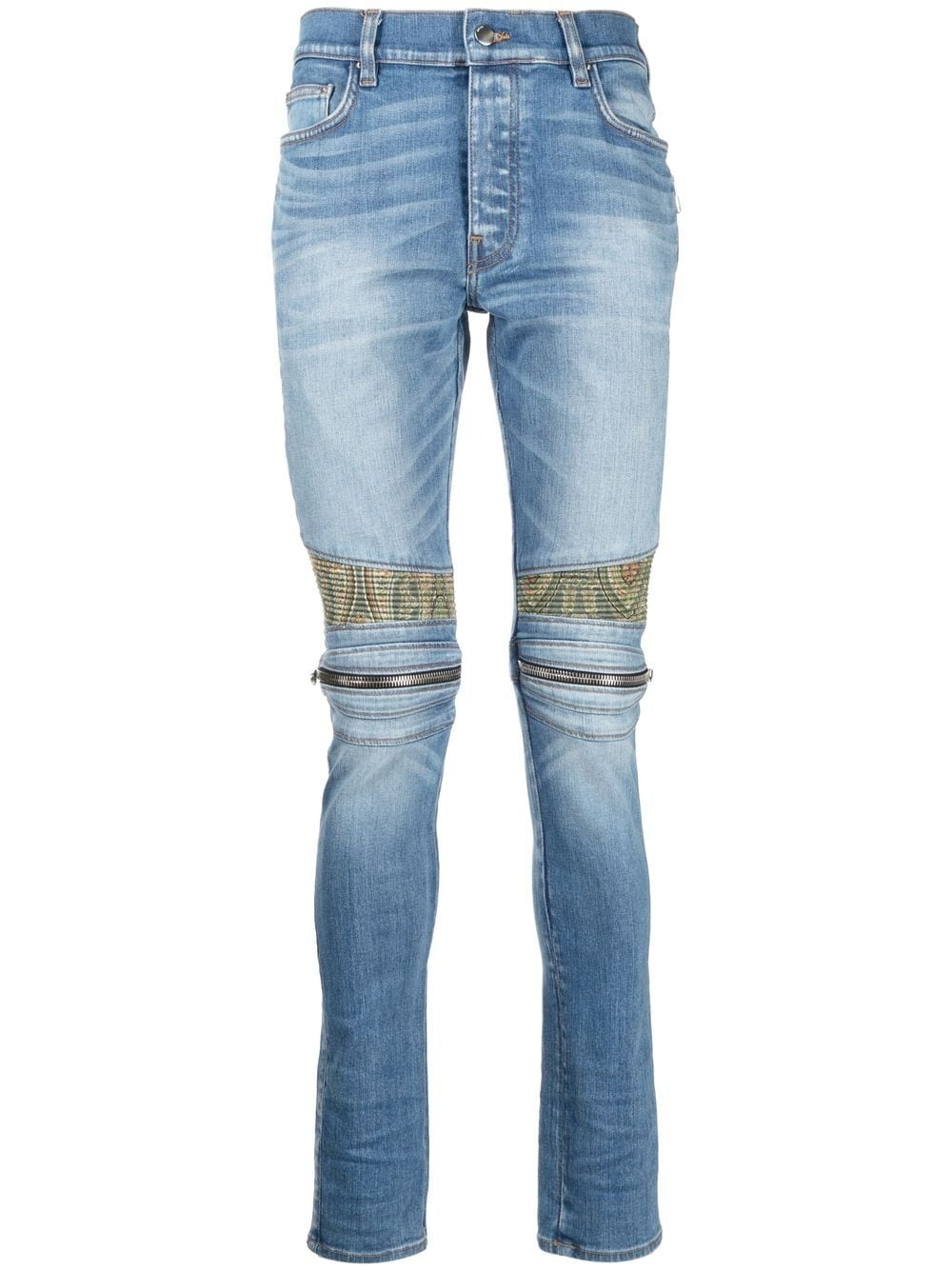 PAISLEY MX2 JEAN 70's Indigo Straight-Fit Jeans "Blue" Always quirky, AMIRI sets these skinny jeans apart thanks to paisley-printed panels at the knees. Highlights - Blue - Stretch-cotton - Faded effect - Patch detail - Ribbed panelling - Belt loops - Front button fastening - Zip fastenings - Classic five pockets Made in United States Composition Cotton 92%, Polyester 6%, Elastane 2% SIZE & FIT Model measurements Height 6 ft 2 in(1.87 m) Bust/Chest 34.25 in(87 cm) Hips 36.22 in(92 cm) Waist 29.52 in(75 cm)