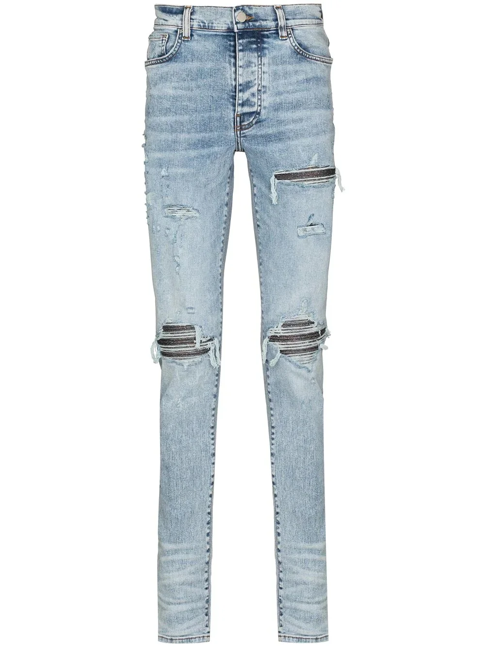 ripped-finish skinny jeans AMIRI focuses on an individual aesthetic for its pieces, and that is reflected in these jeans. Cut to a skinny silhouette, they boast distressed detailing for an effortless look. Made in United States Composition Cotton 92%, Polyester 6%, Elastane 2% Washing instructions Dry Clean Only
