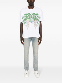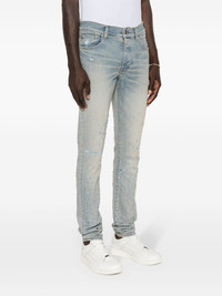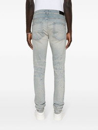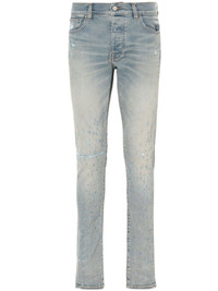Shotgun mid-rise skinny jeans AMIRI says the frayed holes on its Shotgun jeans ‘continue the house's exploration of material distortion through a specialized battle-worn treatment.’ They’re cut from faded Italian denim to a skinny profile. Highlights - Light blue - Cotton blend - Denim - Distressed effect - Ripped detailing - Logo patch to the rear - Logo plaque to the rear - Whiskering at the thighs - Belt loops at the waist - Classic five-pocket design - Skinny cut - Concealed front button fastening Made in United States Composition Cotton 92%, Elastomultiester 6%, Elastane 2% SIZE & FIT Model measurements Height 6 ft 2 in(1.87 m) Bust/Chest 36.41 in(92.5 cm) Hips 37 in(94 cm) Waist 29.52 in(75 cm) FittingInformation Designed for a skinny fit, these jeans offer a close fit throughout Constructed from stretch denim, this piece offers a stretch fit with durability This piece fits true to size – take your usual size Washing instructions Dry Clean Only